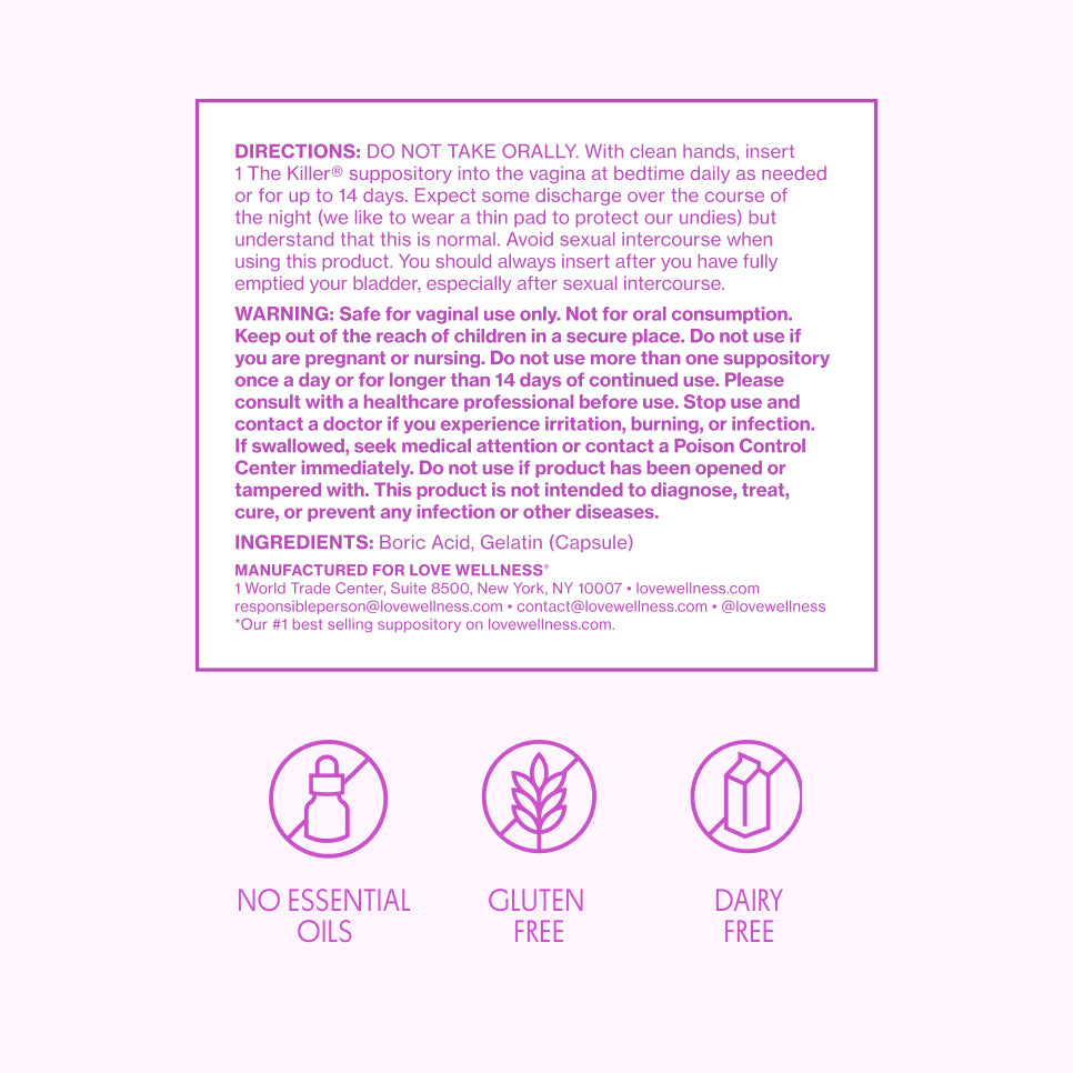 Old-school solutions weren't cutting it, so we teamed up with experts in 2016 to bring you our incredibly popular boric acid suppository for fresh vaginal odor. The Killer® is formulated with just one powerful ingredient — boric acid. It provides fast support and, unlike other brands, is made without fragrance or essential oils.